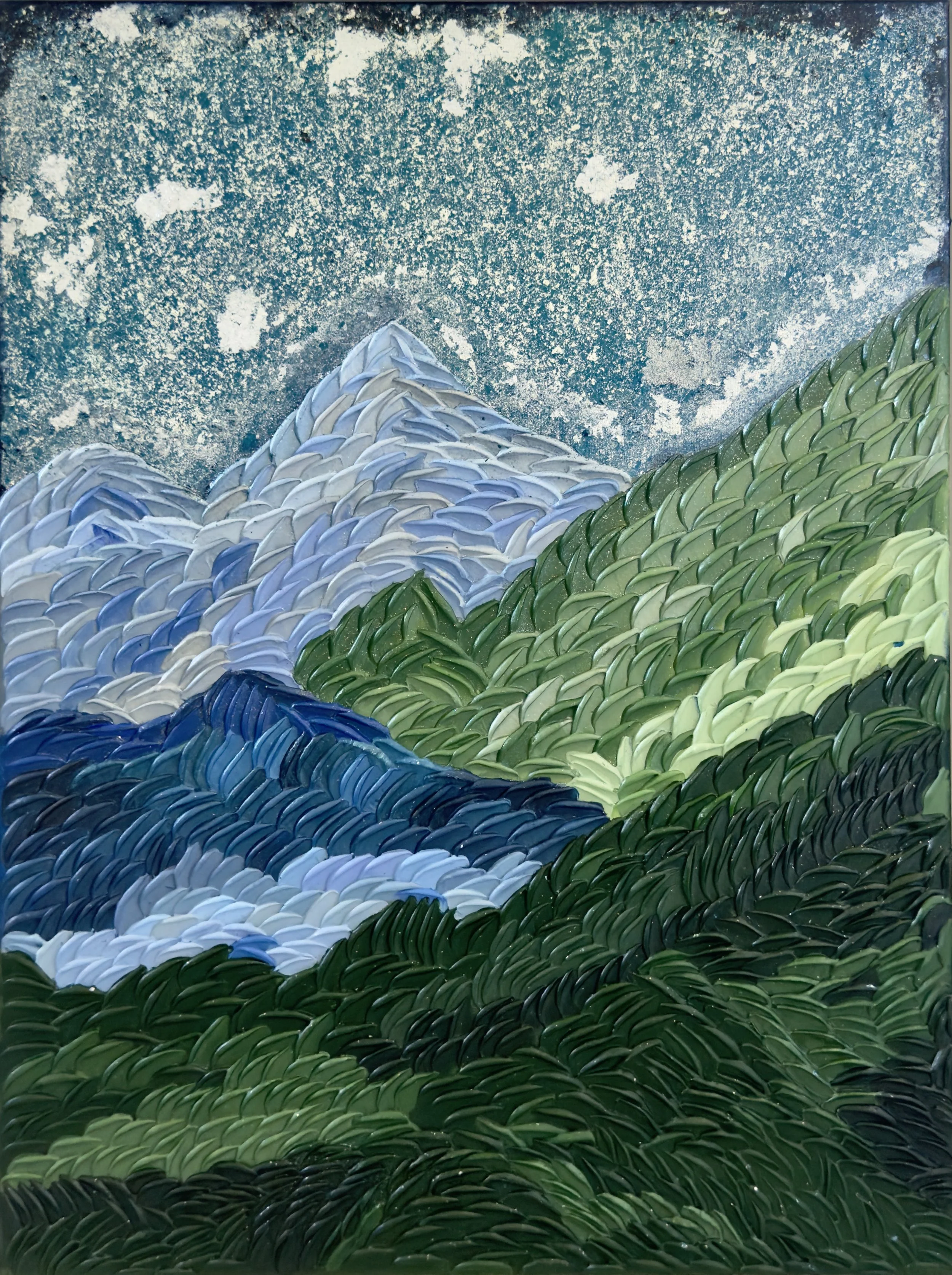 Bucolic Slopes, 2024. Textured acrylic on canvas with high gloss varnish for protection. 80x60 cm