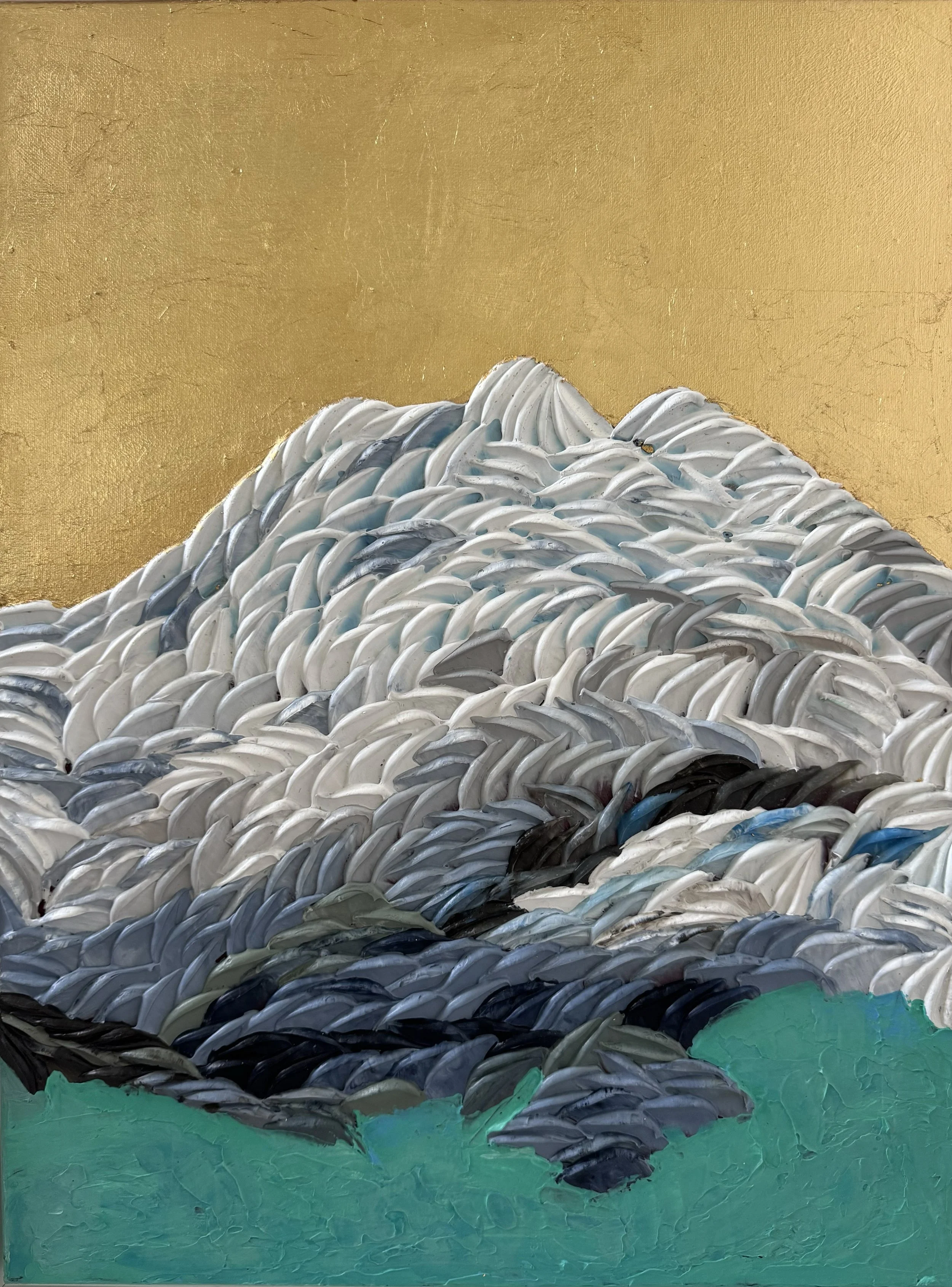 Chamonix, 2024. Textured acrylic on canvas with gold leaf and high gloss varnish for protection. 60x46 cm